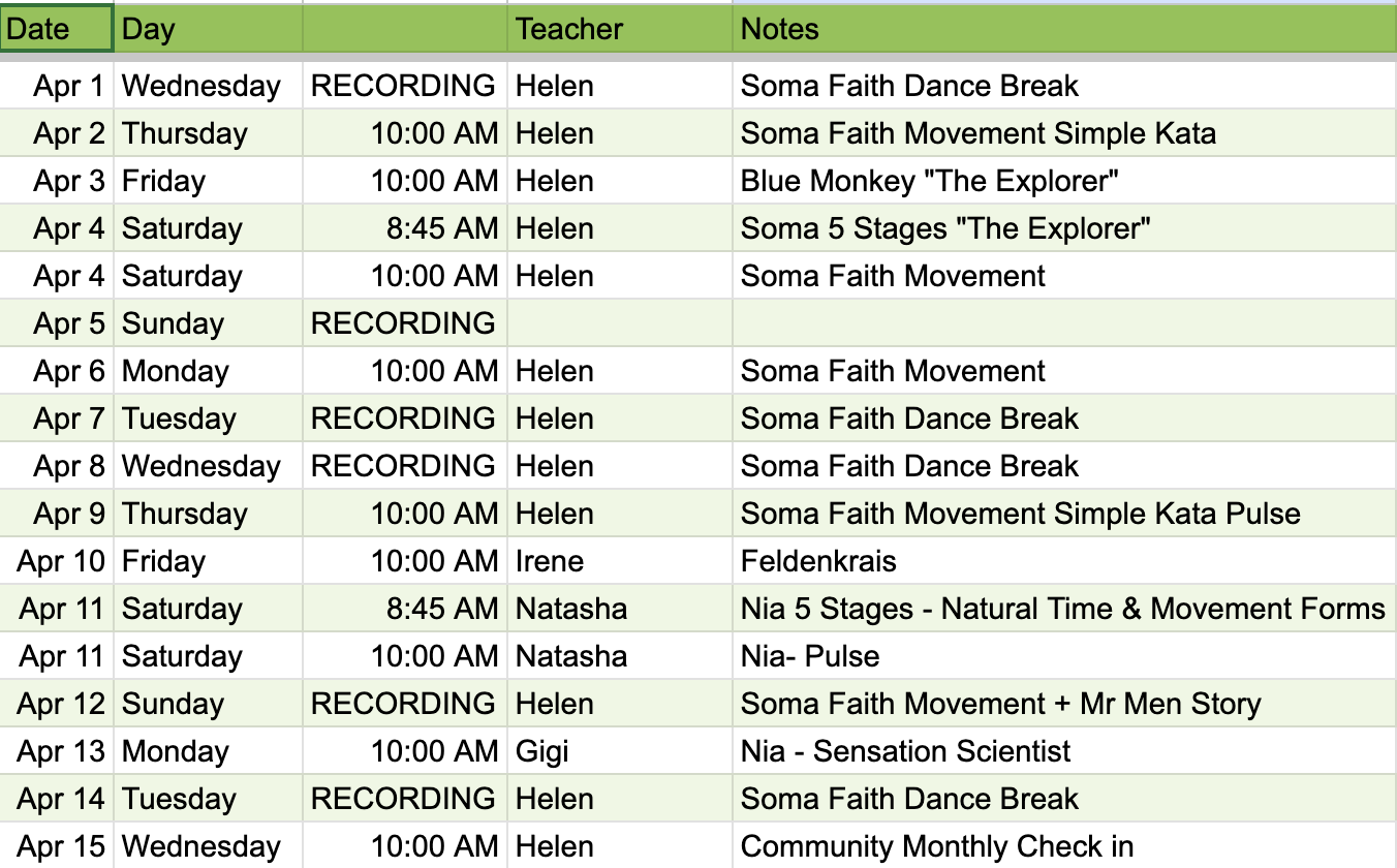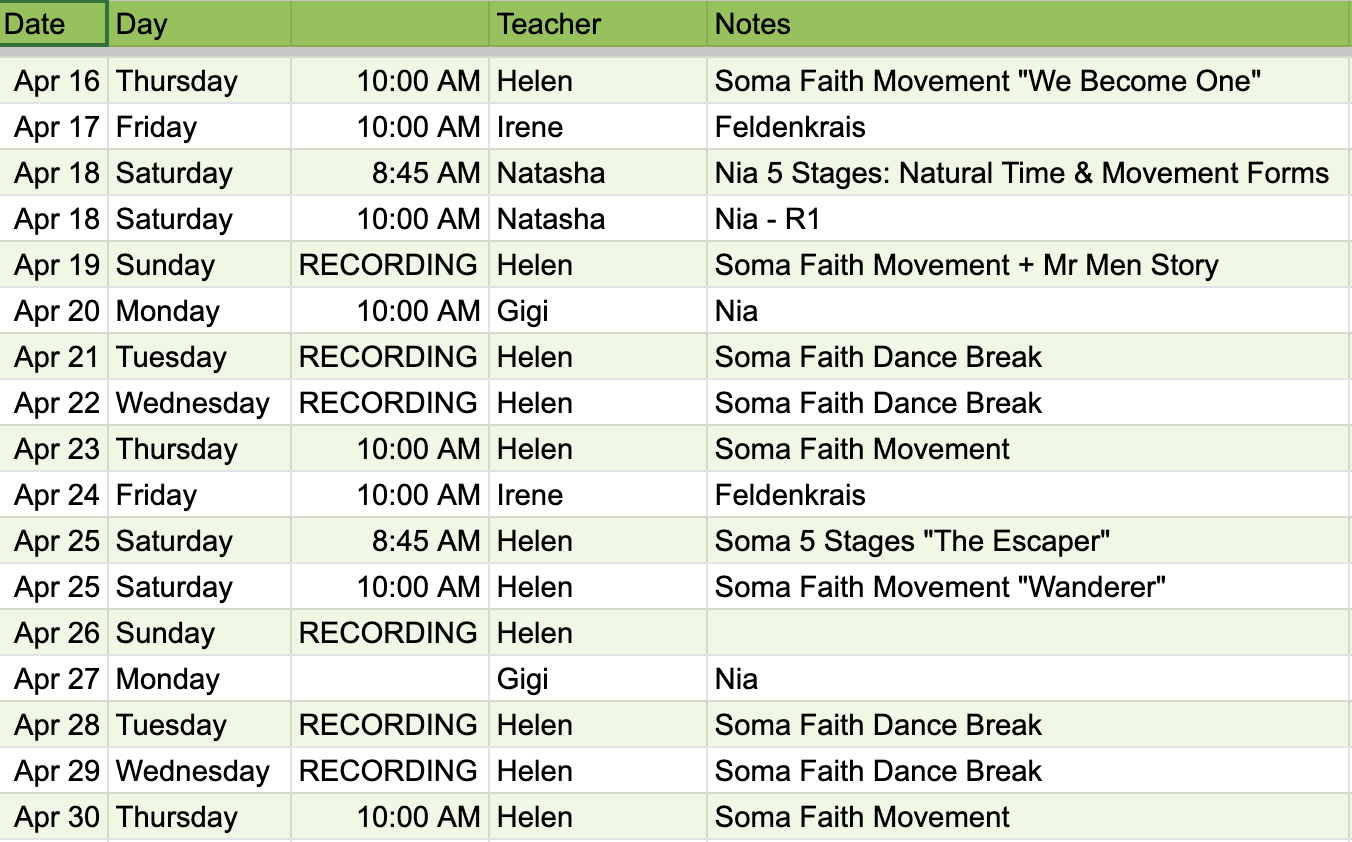 There will be live movement classes 10am Monday, Thursday, Saturday, 8am Fridays, plus Saturday 8:45 5 Stages Developmental Experiences, all via zoom with replays.
